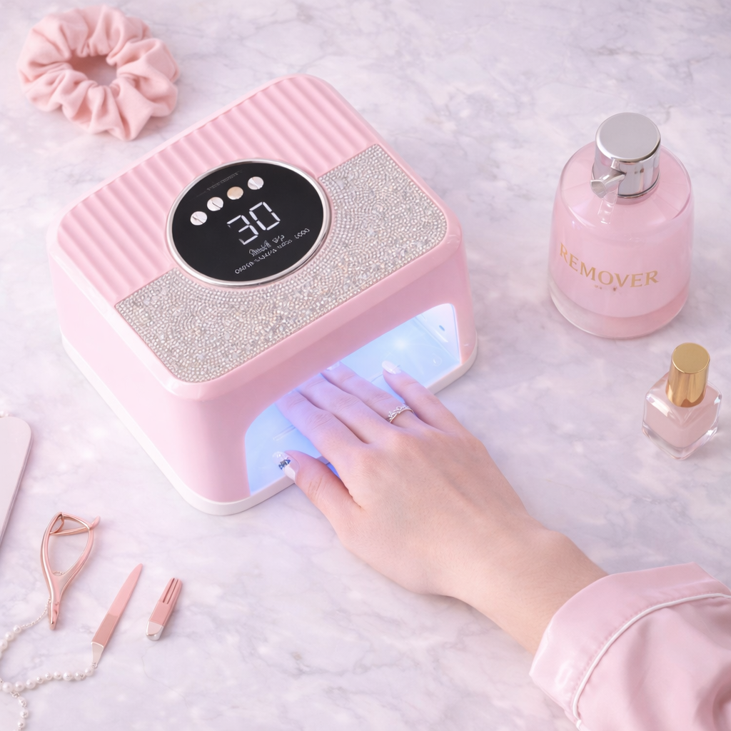 Turn your nail routine into a true beauty moment with this professional UV LED nail dryer, designed to deliver salon-quality results from the comfort of your home. Its elegant pink and white design, enhanced with sparkling rhinestone and glitter details, makes it a standout piece on any beauty vanity.